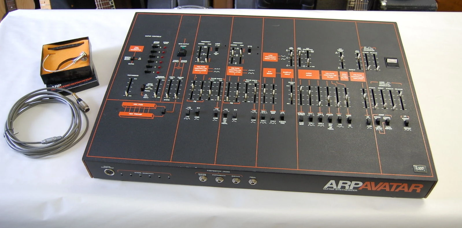 A guitar synthesizer created by ARP Instruments, first marketed in 1979. The Avatar was built around the guts of an Odyssey, their popular monophonic performance synth. To this, ARP added an input for a hex pickup, priority circuitry for selecting which string would trigger the synth, a pitch converter for generating the control voltage, a trigger circuit, and an envelope follower for tracking the guitar's dynamics. As a bonus, ARP also put in an effect called hex fuzz, in which each individual string input was put through a distortion circuit and the outputs of those mixed; the hex fuzz had no connection with any of the synth circuitry. Unlike its primary competition, the Roland GR-500, the Avatar did not come with a dedicated guitar; instead it came with a hex pickup which the user could mount on a guitar of their choice.